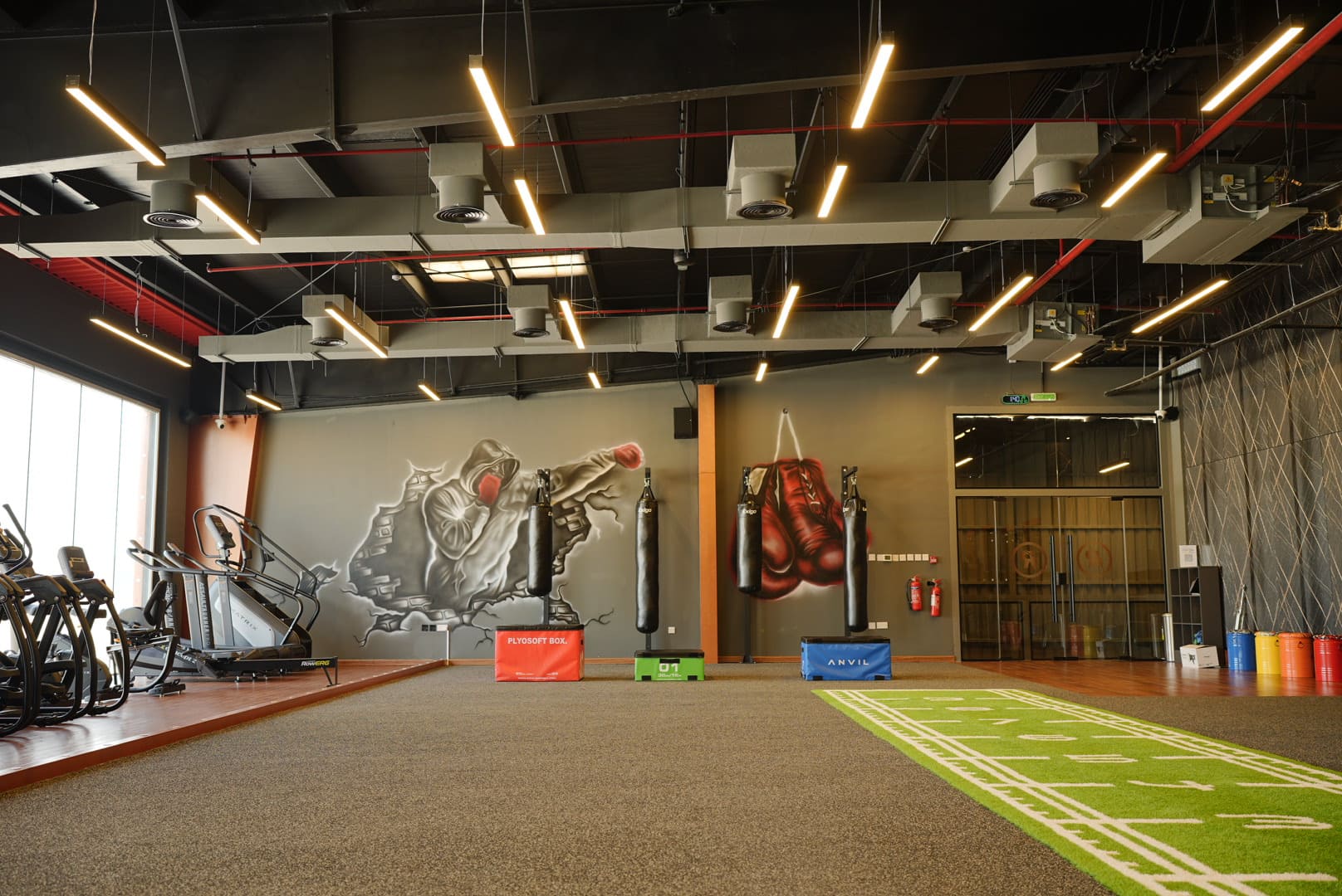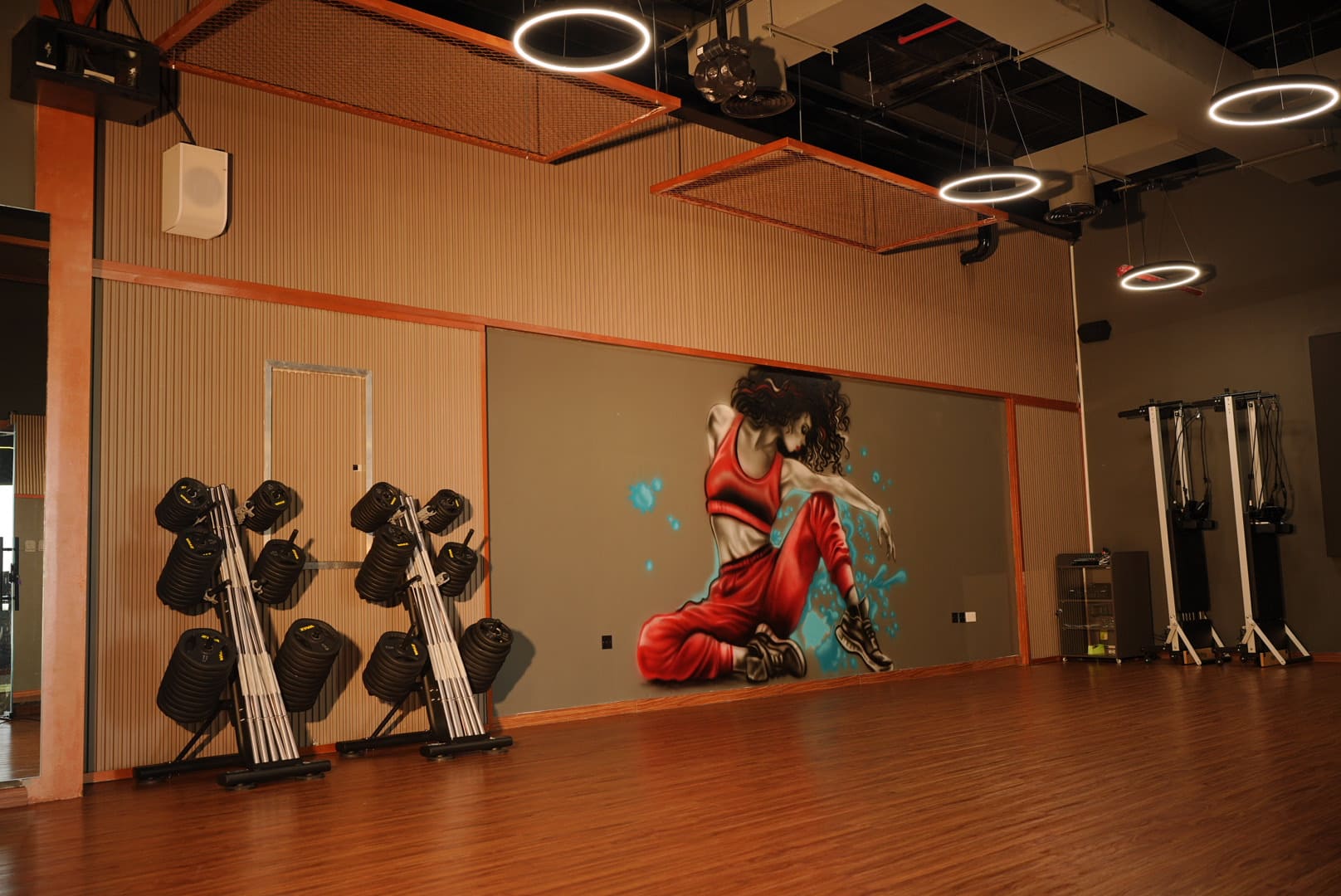 Vibrant studio for energetic group workouts, fostering motivation and camaraderie among members.